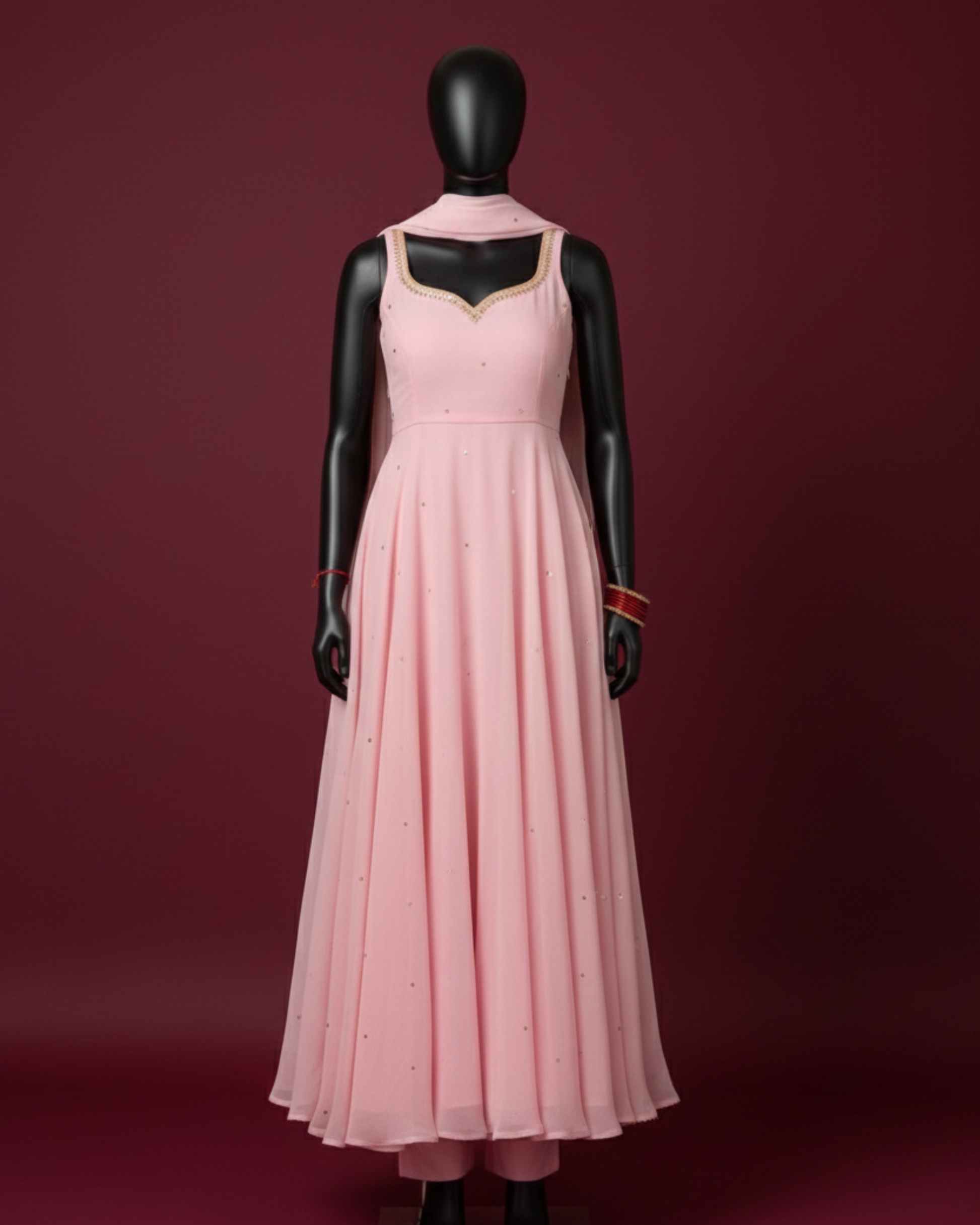 The Anarkali gown, tailored in soft georgette, drapes fluidly with every step—adorned with delicate sequin accents (likely small gold or tone-on-tone) that shimmer like morning dew. Its sweetheart neckline, framed by subtle gold lace trim, adds a romantic contour that flatters the form with effortless sophistication. The silhouette is sleeveless with a fitted bodice and a dramatically flared skirt.