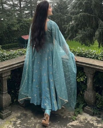 Luminous and serene, the Celestial Sea Anarkali Set captures the essence of a tranquil ocean under a starlit sky. This ensemble features a majestic, floor-length Anarkali gown in a breathtaking teal-blue hue, adorned with delicate gold sun-motif embroidery that radiates regal sophistication. The sweeping flare is perfectly complemented by a lightweight, matching dupatta sprinkled with shimmering accents, creating an aura of timeless grandeur for your next festive occasion.