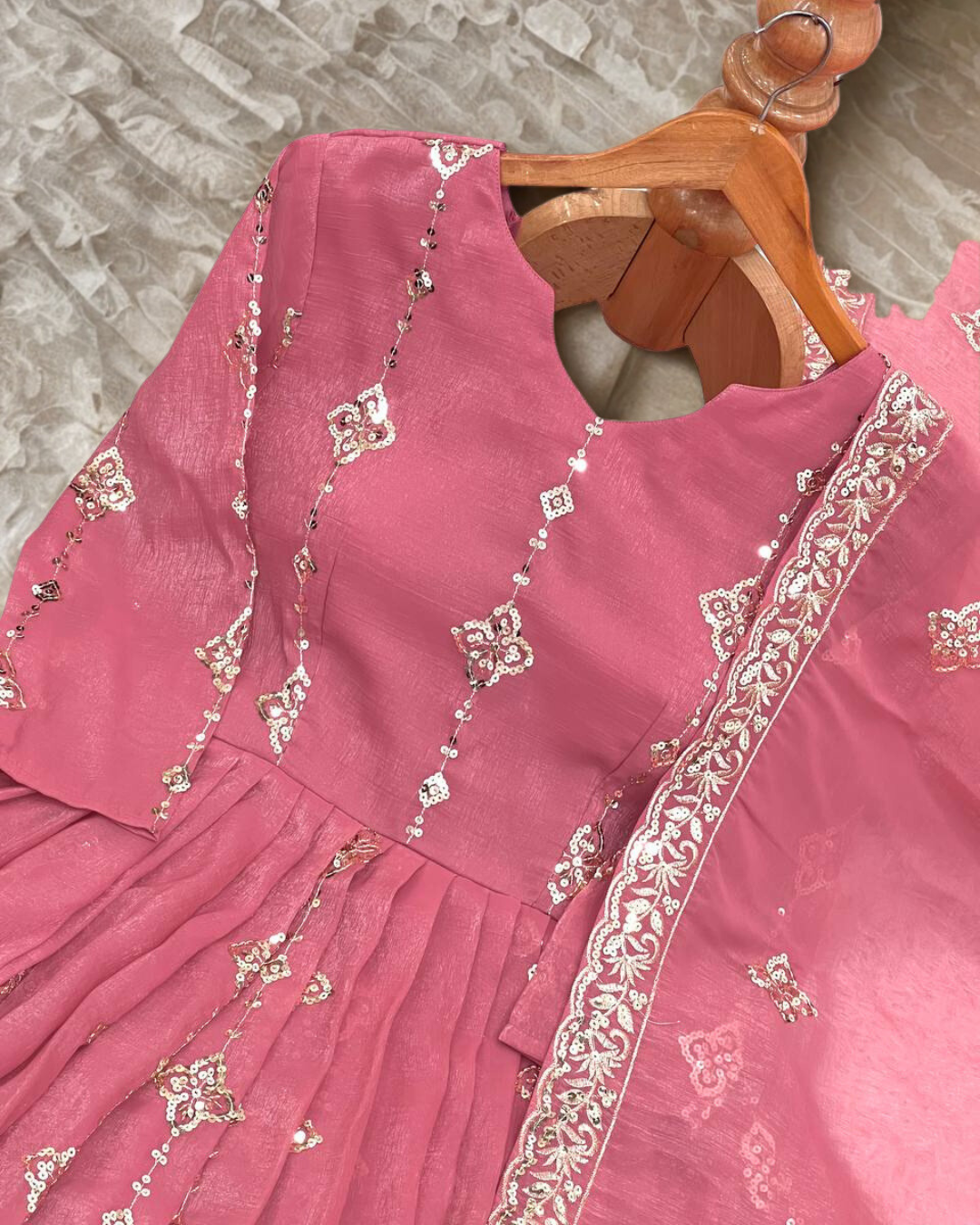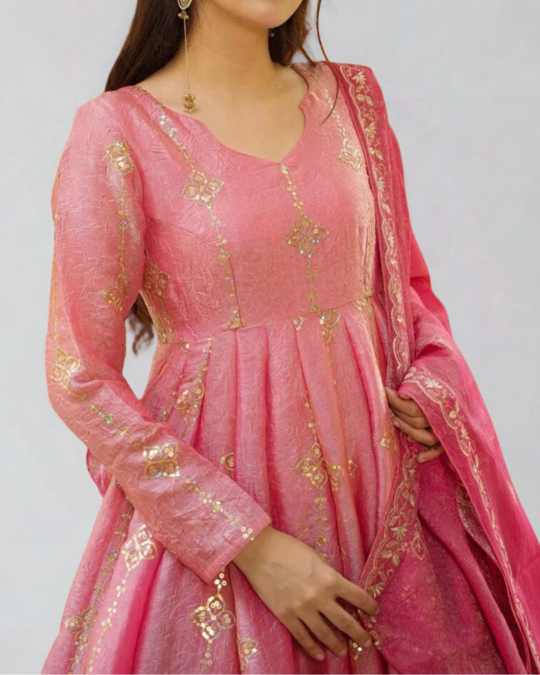 Soft, luminous, and steeped in festive charm, the Blush Royale Anarkali Set captures timeless Indian elegance in a radiant rose-pink hue. The full-sleeved Anarkali is adorned with intricate gold motifs and a richly embellished border that adds graceful movement to every twirl. A matching dupatta with delicate gold detailing completes the ensemble in perfect harmony.
