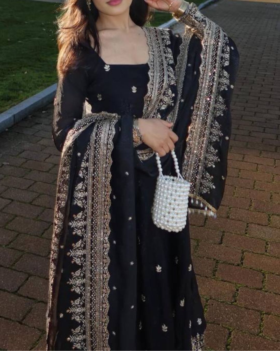 Deep, dramatic, and undeniably regal, the Sultry Sovereign Anarkali Collection is a tribute to timeless festive opulence. Available in three commanding shades—Classic Black, Rich Maroon, and Majestic Bottle Green—this gown is designed for the woman who commands the room. Featuring a fitted, embroidered bodice with full sleeves and a sweeping, floor-length flare, each piece captures the essence of festive grandeur.