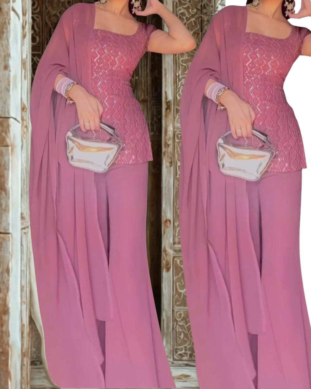 Vibrant and versatile, the Twilight Harmony Sharara Collection brings a spectrum of elegance to the modern festive wardrobe. Available in three stunning shades—Ruby Red, Moonlit Azure, and Dusty Mauve—this ensemble features a meticulously embroidered short kurti with a geometric sequin pattern, paired with flowing, high-flare sharara pants that create a graceful silhouette with every step.